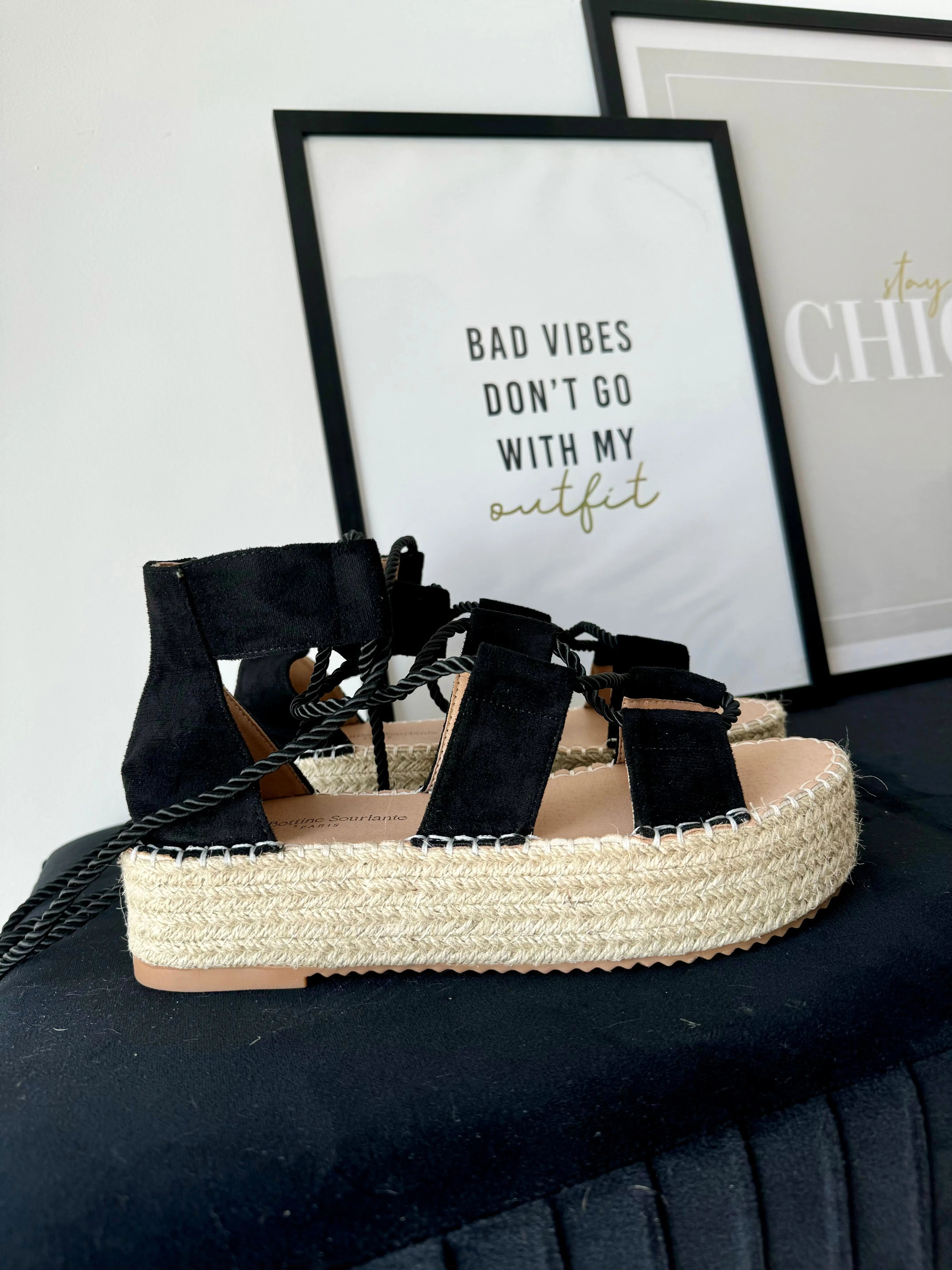 Les sandales s’accrochent avec un laçage en corde noir.